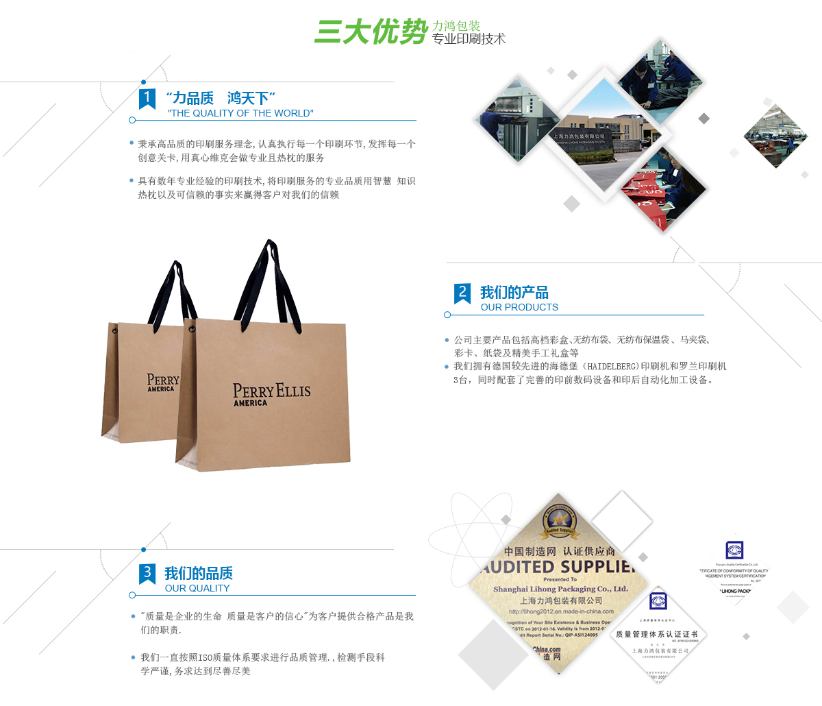 力鴻包裝有限公司創(chuàng)立于2007年,位于上海大虹橋商圈,毗鄰國(guó)家會(huì)展中心,廠(chǎng)區(qū)建筑面積15000多平方米,公司經(jīng)過(guò)十幾年的高速發(fā)展,現(xiàn)已成為一家以生產(chǎn)紙制品、印刷包裝為主的中大型專(zhuān)業(yè)印刷企業(yè)。公司主要產(chǎn)品包括彩盒、無(wú)紡布袋、 無(wú)紡布保溫袋、馬夾袋、彩卡、紙袋及精美手工禮盒等。我們擁有德國(guó)先進(jìn)的海德堡(HAIDELBERG)印刷機(jī)和羅蘭印刷機(jī)3臺(tái),同時(shí)配套了完善的印前數(shù)碼設(shè)備和印后自動(dòng)化加工設(shè)備。 為客戶(hù)提供優(yōu)良的產(chǎn)品和滿(mǎn)意的服務(wù)使我們孜孜不倦的追求,為此我們不斷精益求精、銳意創(chuàng)新,目前我司擁有專(zhuān)業(yè)技術(shù)工人100余人,他們的專(zhuān)業(yè)知識(shí)和敬業(yè)樂(lè)群的職業(yè)精神已落入到每一項(xiàng)產(chǎn)品和服務(wù)當(dāng)中,我們有豐富的出口操作和OEM項(xiàng)目管理經(jīng)驗(yàn),為您解決一切顧慮。我們可以為海內(nèi)外客戶(hù)提供物美價(jià)廉的產(chǎn)品和便利的服務(wù)。 我們一直以“力品質(zhì)、鴻天下”為企業(yè)宗旨,以“服務(wù)顧客”為企業(yè)使命,并在持續(xù)經(jīng)營(yíng)的發(fā)展過(guò)程...更多>